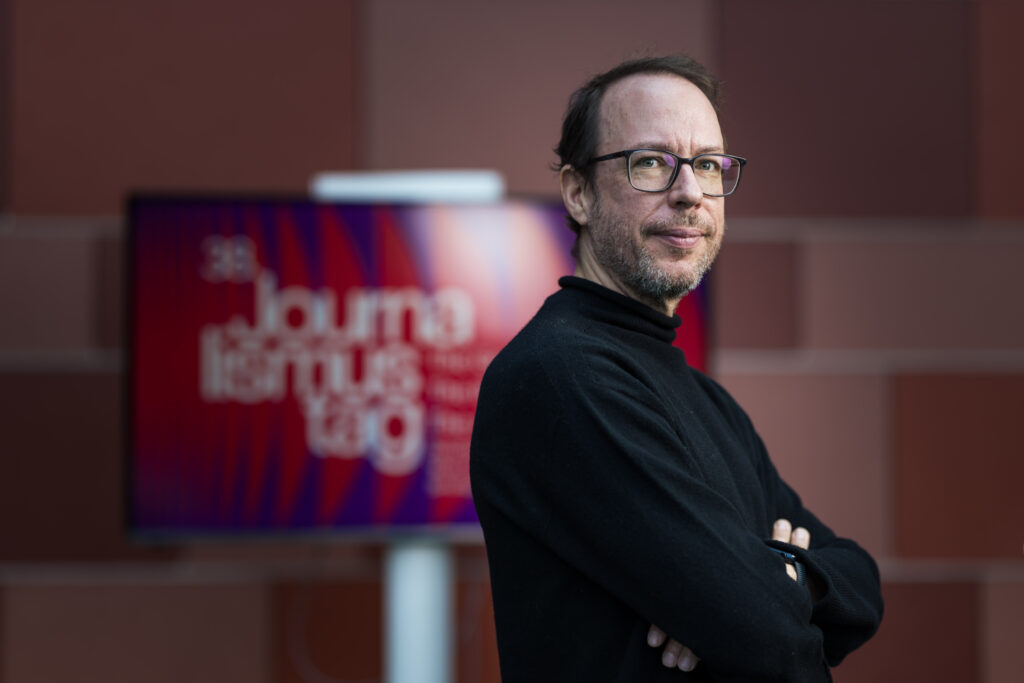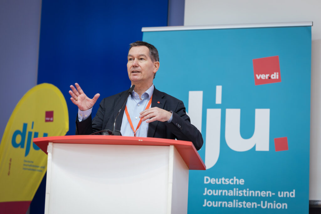 „Journalismus ist mehr als ein Algorithmus“, stellte Christoph Schmitz-Detlefsen vom ver.di-Bundesvorstand eingangs klar. Er brauche Haltung, Organisationen und Menschen, die sich einmischen. Schmitz-Detlefsen skizzierte für den 38. Journalismustag das Problemfeld von der internationalen Entwicklung einer Tech-Oligarchie bis zum vielfältigen Druck auf Medienschaffende, dem Gewerkschaften und Zivilgesellschaft gemeinsam entgegen treten sollten.