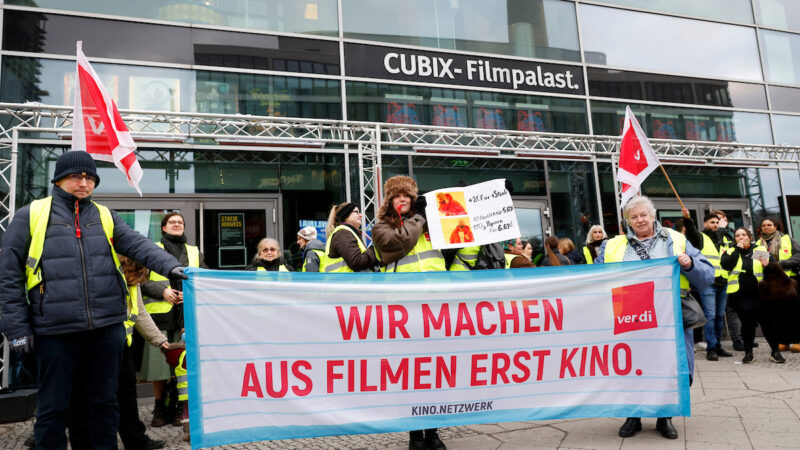 Warnstreik bei CineStar und UCI am Berlinale-Wochenende, Streikkundgebung vor dem Cubix-Filmpalast am Alexanderplatz, ver.di fordert mindestens 16 Euro pro Stunde. Foto: Christian v. Polenz