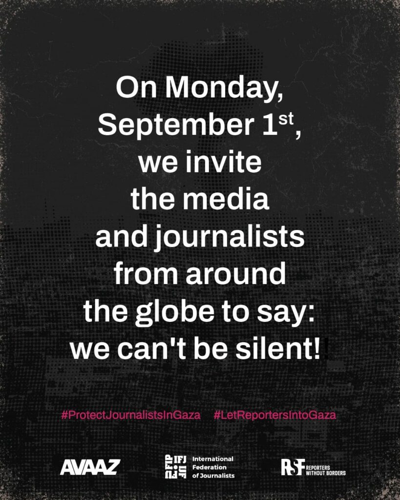 Über 150 Medienunternehmen aus mehr als 50 Ländern werden am heutigen 1. September an einer Medienkampagne teilnehmen, die von Reporter ohne Grenzen (RSF) , der Kampagnenbewegung Avaaz und der IFJ koordiniert wird. Die Redaktionen, RSF und Avaaz verurteilen die Verbrechen der israelischen Armee an palästinensischen Journalist*innen in Gaza, fordern besseren Schutz für die dort arbeitenden Medienschaffenden sowie Notfallevakuierungen und verlangen, dass internationale Berichterstattende unabhängigen Zugang nach Gaza erhalten.