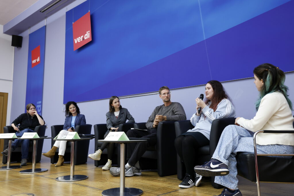 Auf dem Podium sprachen Cansel Kiziltepe (SPD), Arbeitssenatorin Berlin, die Digitalpolitikerin und Bundestagsabgeordnete Sonja Lemke (Linkspartei), Camilla Salim Wagner vom Weizenbaum Institut, Moritz Altenried von der HU Berlin und die TikTok-Analystin Lena, die über ihre konkrete Arbeit berichtete.